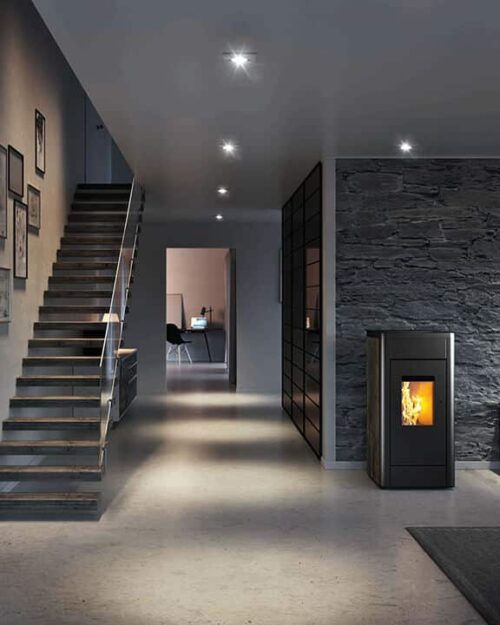 Ovnen har et magasin med plads til 21 kg træpiller, og med den medfølgende fjernbetjening eller touch-displayet kan du let tænde, slukke og justere varmen.